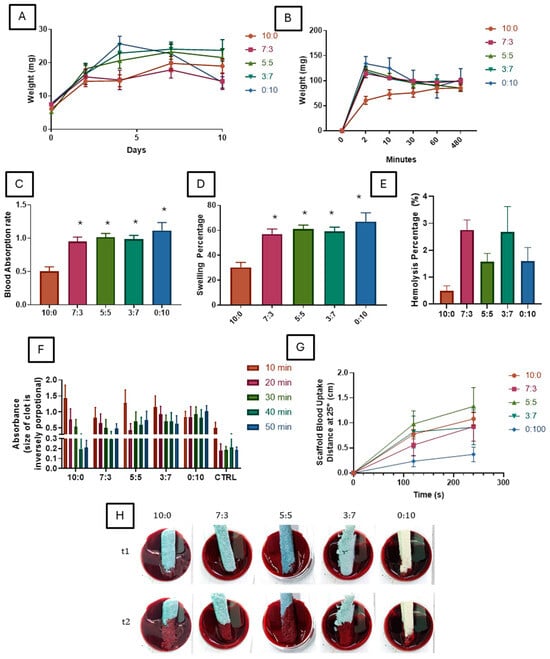 Hemocompatibility and Blood Interaction Properties of Gelatin–Carrageenan Scaffolds. (A) Scaffold degradation in blood over 10 days, with faster degradation for carrageenan-rich scaffolds (3:7, 0:10). (B) Scaffold weight changes in blood absorption, showing stability after initial uptake. (C) The blood absorption rate is significantly higher in carrageenan-rich scaffolds (* p < 0.05 vs. 10:0). (D) Swelling percentage in blood, higher in carrageenan-containing scaffolds (* p < 0.05 vs. 10:0). (E) Hemolysis percentage, with a dose-dependent increase in carrageenan-rich scaffolds. Positive control 100%, negative control 0% (F) Blood coagulation assay absorbance, indicating slower clotting for carrageenan-rich scaffolds. (G,H) Blood uptake distance at 25° incline, showing higher uptake in balanced (5:5) scaffolds.