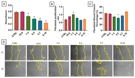 Cytocompatibility and Wound Healing Properties of Gelatin–Carrageenan Scaffolds on Fibroblasts. (A) Fibroblast cytotoxicity measured by absorbance, with the highest viability in control and 10:0 (gelatin-only) scaffold, moderate in 7:3, and significantly lower in 5:5, 3:7, and 0:10 (carrageenan-only) scaffolds (* p < 0.05 vs. CTRL). (B) Fibroblast proliferation rate, peaking in 7:3, lowest in 0:10, showing balanced gelatin–carrageenan compositions support cell growth (* p < 0.05 vs. CTRL). (C,D) Fibroblast wound closure, with highest closure in 0:10, moderate in control and 10:0, and significantly lower in 5:5 (* p < 0.05 vs. CTRL). White line scale bar represents 100 µm.