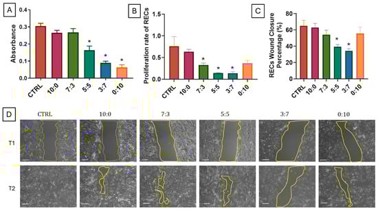Fibroblast cytotoxicity was assessed by measuring the absorbance of the samples, where higher absorbance values correlate with increased cell viability (Figure 5A). The 10:0 (gelatin-only) scaffold and the control group recorded the highest absorbance, indicating minimal cytotoxic effects and suggesting that gelatin-only scaffolds are well-tolerated by fibroblasts. In contrast, the 0:10 (carrageenan-only) scaffold demonstrated significantly lower absorbance, indicating increased cytotoxicity and reduced cell viability. Intermediate absorbance values were observed for the 7:3, 5:5, and 3:7 scaffolds, which were all significantly lower than the control (* p < 0.05), suggesting that incorporating carrageenan reduces scaffold biocompatibility to some extent.