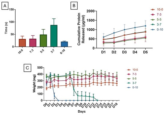 The degradation behavior of the scaffolds was evaluated in the presence of 0.00006% collagenase type 1 (Figure 2B,C). The scaffolds containing higher concentrations of carrageenan (0:10 and 3:7) exhibited rapid degradation, with complete dissolution occurring within 24 and 48 h, respectively. In contrast, scaffolds with higher gelatin content exhibited a slower degradation rate, with gelatin-only scaffolds taking up to 23 days to fully degrade. Interestingly, the degradation process varied depending on the gelatin ratio; the 0:10 scaffold swelled and formed a thick, watery gel, while the 3:7, 5:5, and 7:3 scaffolds disintegrated into smaller pieces, the gelatin-only scaffolds (10:0) maintained their shape, becoming progressively smaller and thinner over time. This differential degradation behavior underscores the gelatin-to-carrageenan ratio’s role in influencing scaffold stability and dissolution. Numerous factors, including porosity, pore size, composition, swelling, and hydrophilicity, influence scaffold degradation rate. Studies have shown that porosity and pore size regulate the degradation rate and the release of degradation products from scaffolds []. However, in our study, we found that, even with similar porosity and pore size, a group with higher concentrations of carrageenan degraded faster than the group with gelatin, which showed that the architecture of the scaffold does not influence the degradation of these scaffolds.