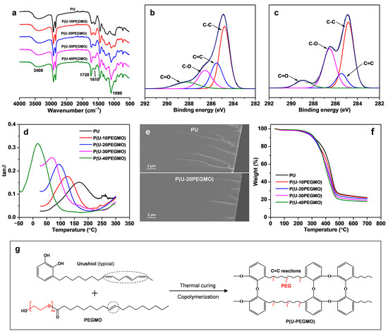 Characterization of urushiol-based coatings: (a) IR spectra, (b) C1s XPS spectra of PU, (c) C1s XPS spectra of P(U-30PEGMO), (d) DMA curves, (e) SEM images, (f) TG curves, and (g) proposed reaction scheme between urushiol and PEGMO.