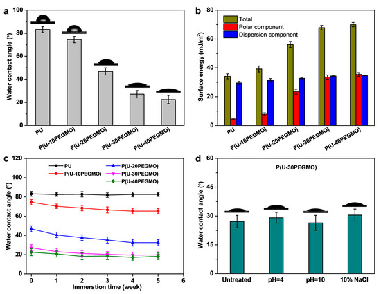 Contact angle measurement is an effective quantitative method for evaluating the surface wettability of polymer materials. Figure 2a shows the water contact angles of the urushiol-based coatings. The contact angles progressively decreased from 83.2° for PU to 74.5°, 46.8°, 27.1°, and 22.5° for P(U-10PEGMO), P(U-20PEGMO), P(U-30PEGMO), and P(U-40PEGMO), respectively. The PU coating exhibited limited surface hydrophilicity due to its structural backbone, which primarily consists of non-polar benzene rings and aliphatic hydrocarbons, with only a small amount of polar oxygen-containing groups [35]. In contrast, the introduction of PEGMO macromonomer greatly enhanced the surface hydrophilicity of the modified coatings, correlating with an increased PEGMO content. This enhancement stems from the incorporation of the strongly polar PEG segment in the macromonomer (Figure 1g). When PEG interacts with water, its oxygen atoms readily form hydrogen bonds with the water molecules, allowing the PEG chain to tightly bind with water and demonstrating superior hydrophilicity [36]. Furthermore, research has demonstrated that surface hydrophilicity is highly dependent on the density of polar groups present on the material’s surface [37]. Consequently, as the PEGMO content reached 30% or higher, the contact angle of the modified coating dropped sharply to below 30°, indicating a high degree of hydrophilicity. This remarkable improvement can be attributed to the significantly increased content of surface polar C-O-C groups (Figure 1c and Table 1).