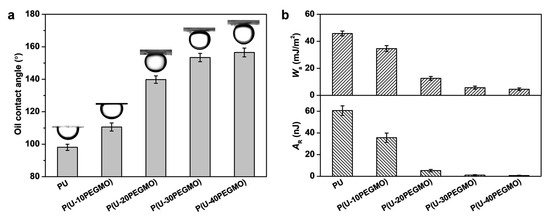 Using the aforementioned underwater oil contact angle values, the adhesion work and residual work of oil droplets on the coating surfaces can be calculated, with the results shown in Figure 3b. Adhesion work refers to the work required by an external force to separate a solid–liquid interface of a unit area from the junction [42]. Residual work, a concept in the principle of washing and decontamination, is the external work needed to drive the contact angle of an oil droplet from its equilibrium value to 180°, allowing the oil droplet to completely detach from the solid surface through the “rolling up” mechanism [27,43]. Therefore, both the adhesion and residual work can be used to assess the oil detachability from a thermodynamic perspective. As seen in Figure 3b, the P(U-PEGMO) coatings exhibited greatly lower adhesion and residual work compared to the PU coating, with their values decreasing to below 6.0 mJ/m2 and 1.5 nJ, respectively, when the PEGMO content reached 30% or higher. This finding suggests that oil droplets can detach from the coating surface with minimal external energy input.
