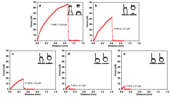 Force–distance curves and images during adhesive force tests when oil droplets detached from urushiol-based coating surfaces: (a) PU, (b) P(U-10PEGMO), (c) P(U-20PEGMO), (d) P(U-30PEGMO), (e) P(U-40PEGMO).