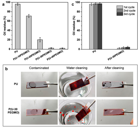 Building on prior studies of the surface wettability and oil detachability, the cleaning performance of the P(U-PEGMO) coating was investigated using a simple water rinsing method. In the experiment, a measured amount of hexadecane was applied as a model oil to contaminate the coating. After water rinsing, the residual oil remaining on the coating surface was weighed to quantitatively evaluate the cleaning efficiency. As shown in Figure 5a, the oil residues on the PU and P(U-10PEGMO) coatings exceeded 70 wt% following the cleaning process, indicating that these coatings were difficult to clean with water alone once contaminated. In contrast, when the PEGMO content was increased to 30% or higher, the P(U-30PEGMO) and P(U-40PEGMO) coatings demonstrated significantly reduced oil residues of only 2.4 wt% and 2.1 wt%, respectively, highlighting their excellent easy-cleaning properties. Figure 5b shows images of the cleaning process on the coating surfaces (with oil droplets dyed red for clarity), allowing for further insight into their cleaning behaviors. After a simple water rinse, oil droplets remained tightly adhered to the PU surface without detachment. Conversely, when the P(U-30PEGMO) coating was contaminated with oil and subjected to gentle shaking in water, a substantial amount of oil pollutants detached from its surface and floated in the water. Following cleaning, a layer of water film formed on the coating surface, leaving no visible oil residue. The superior easy-cleaning performance of the modified coatings can be attributed to their high surface hydrophilicity (Figure 2a). When contaminated with oil and rinsed with water, the highly hydrophilic coating surfaces readily hydrate to form stable and dense hydration layers, which impart strong oil-repellent properties (Figure 3a) and greatly reduce oil droplet adhesion (Figure 4). As a result, only a minimal external force, such as gentle shaking in water, is required to replace the coating/oil interface with the coating/water interface, thereby achieving effective surface cleanliness.