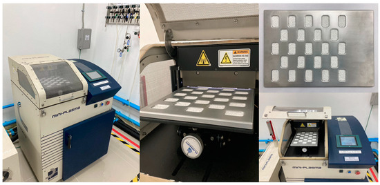 Before the plasma treatment, bamboo and hemp fibers were mildly alkaline treated in an aqueous NaOH solution (20% w/v) at 80 °C for 5 h. The pulps were bleached with NaClO2 to remove lignin and hemicellulose, as described in our previous report [28]. The fibers were sieved through a 180 µm sieve. The bamboo and hemp fibers were treated for surface modification using a DBD plasma approach. The DBD plasma machine is shown in Figure 1. The fibers were put on the tray, while DBD was generated through two parallel high-power electrodes covered by a thin quartz foil. The grounded electrode can be adjusted to change the discharge gap for the fibers. The DBD plasma was generated by a high-voltage power of 180 W (3.45 W/cm2) with a constant frequency of 13.56 kHz. Ar + O2 gasses were used for plasma flow rates of 8 and 10 L/min, respectively. The DBD plasma was applied on the bamboo and hemp fibers for 2.5, 5, 10, 15, and 20 min. The treated fibers under each plasma condition were modified on the surface by mixing into an NH4OH solution (1:10% w/v). The sample was heated by a hot plate at 60 °C and stirred continuously for 1 h. Afterward, the NH4OH solution was evaporated from the final product by heating at 60 ± 2 °C for 48 h.