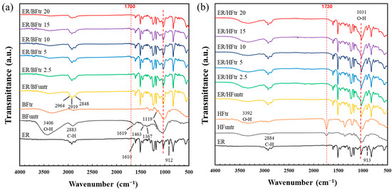 The chemical characteristics of the fiber-reinforced epoxy composites evaluated by FTIR spectroscopy for bamboo and hemp fibers with DBD plasma treatment are shown in Figure 2. The untreated and treated fibers exhibited hydroxyl (O−H) stretching vibrations at 3330 to 3400 cm−1 [34,35]. The band at 2890 cm−1 was assigned to the C−H stretching vibration of the cellulose fiber containing a functional group of alkanes [36], while the band at 1635 cm−1 was attributed to the aromatic of lignin [37,38]. The peak around 1730 cm−1 was indicated to the carbonyl (C=O) stretching of acetyl groups of hemicellulose [39]. Both plasma-treated and untreated fibers exhibited peak disappearance of lignin at 1635 cm−1 partly due to the alkaline treatment and blenching before the plasma treatment. In the ER/BF and ER/HF composites, ER exhibited C−C stretching peaks at 1610 and 1585 cm−1 and C=C stretching vibrations of the ER aromatic ring at 1508 and 1454 cm−1 [40]. The bands at 1241, 913, and 827 cm−1 were C−O symmetrical stretching, C−O asymmetrical stretching, and C−O−C stretching in the oxirane ring, respectively [41,42]. For the plasma-treated composites, an increase in peak intensity at 3200−3600 cm−1 was observed due to O−H stretching of hydroxyl groups of the fibers. The treatment with the Ar + O2 gas generated the polar groups of carbonyls (C=O) and carboxyl (−COOH) at 1680−1720 cm−1. In addition, carbon hydrogen group (CH2, CH3) stretching was observed at 2850–3000 cm−1 [28,43]. The amount of oxygen-containing groups on the surface increased with the time of plasma treatment owing to bonding between the fiber and resin [44]. However, the epoxy groups of ER (912 cm−1) were not observed on the ER/BFtr composite (Figure 2a). The ER/BFtr composites exhibited a new shoulder peak at 1700 cm−1, which disappeared upon the treatment for 20 min. This new peak indicates a new C−O formation from the reaction between the ER and BF surface, which changed the form with the 20 min treatment. HFuntr exhibited –COOH at 1730 cm−1 and C−O at 1360 cm−1. The intensities of these two peaks increased with the plasma treatment due to the increasing contents of the −COOH and C−O groups on the surface of HF. The results indicate that the −COOH groups react with NH4OH and epoxy groups of ER. −COOH groups disappeared after mixing with ER. The results also indicate that −NH2 groups graft on the fiber surface and react with epoxy groups of ER. For the ER/HF composites, the intensity of epoxy groups of ER at 912 cm−1 decreased with the time of plasma treatment owing to the high reaction rate between the surface of HF and ER. The plasma treatment improves the reactive functional groups of the fibers surface, which react with epoxy groups of the ER main matrix [10,42,45]. The plasma treatment caused changes in the chemical and physical structures of the bamboo and hemp fibers [27,46,47], resulting in the formation of functional groups that induced bonds and interfacial adhesion between EB matrix and the fiber. These reactions could improve the properties of composites.