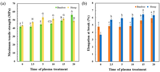 Comparison of tensile properties between bamboo and hemp fiber-reinforced epoxy composites, untreated (0) and treated with Ar + O2 for 2.5–20 min + NH4OH. (a) Maximum tensile strength (MPa) and (b) elongation at break (%). The mean values of the tensile strength (uppercase letter) and elongation at break (lowercase letter) differ significantly (p < 0.05).