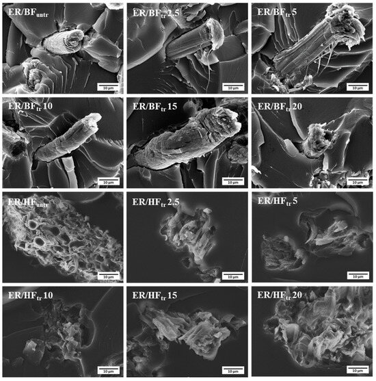 SEM was employed to acquire fractured surface images of the composites. Figure 4 shows the morphologies of the fiber-reinforced epoxy composites with bamboo and hemp structures, untreated and plasma-treated for different times. The ER/BFuntr composite with the untreated fibers exhibited a smooth surface of the bamboo fiber similar to that of the ER/BFtr 2.5 sample. The increase in the time of plasma treatment (5–20 min) resulted in a high fiber roughness due to the oxygen in the discharge gasses inducing oxygen groups onto the fiber structure. The plasma treatment induces etching and formation of chemical species on the surface, which corresponds to the roughness [54]. Fine BFtr and HFtr fibers distribution on ER matrix were observed, which provided the properties improvement of composite [55,56]. The bamboo fiber-reinforced composites exhibited obvious gaps between fibers and matrix due to the plasma treatment with O2 gas resulting in surface etching and reducing the polarity of the fiber by the formation of oxygen bonding [28,57,58]. Reduction in gaps between the BF surface and ER matrix were observed for the plasma treatment of 20 min, which related to the increased tensile strength. However, ER/HFtr20 showed low gaps between HF and ER matrix with reduction in tensile strength due to the occurred degradation of HF fiber which was weaker structure than BF fiber. Combination between interfacial crosslinking and fiber degradation provided slightly decreased tensile strength. The SEM images of the HF-reinforced composites showed different characteristics from those of the bamboo fibers. The morphology of the ER/HFuntr composite with untreated fibers clearly exhibited hemp stem sections [59] with characteristics of smooth fibers, large pores, and irregular structure [22,52]. The EP/HFtr composites exhibited low gaps between the HF and BR matrix for all treatment times owing to the high interfacial adhesion between HF and BR via chemical and physical HF surface improvements. The ER/HFtr composites exhibited surface improvements without removed fibers due to the excellent adhesion between the HF and EP [28,60]. The DBD plasma affected the etching of the fiber surface, enhanced the roughness, and induced –COOH groups on the HF structure, due to the surface ion bombardment, etching, and ablation of surface layers [61]. Long-term treatment provided crosslinking reaction which improved interfacial adhesion and mechanical properties of the composites.