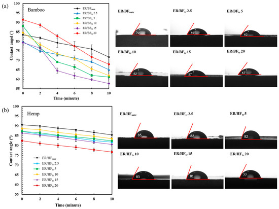 The wettability properties of the composites were calculated using a contact angle measurement, as shown in Figure 6. Water droplets were dropped onto the composite surfaces and automatically recorded from 0 to 10 min. The untreated BF composite (EP/BFuntr) exhibited a contact angle of 72° after 10 min (Figure 6a), which implies a low surface wettability. The treated samples exhibited decreased water contact angles after 10 min with the increase in treatment time (65, 62, 62, and 57°) due to the high polarity of the plasma treatment, which increased with the 20 min treatment (67°) because of the high crosslinking degree and surface roughness effect of BFtr. The ER/HFuntr composite exhibited a contact angle of 85° after 10 min (Figure 6b), which decreased with the enhance in the plasma treatment time (82, 82, 83, 81, 77°). The decreasing water droplet contact angle of ER/HFtr indicates a high amount of generated −COOH and −OH groups on the HFtr structure, which reduced the contact angle by its hydrophilicity. However, for BR/BFtr treated for 20 min, the contact angle was increased due to the high crosslinking density between the BFtr and ER matrix. Crosslinking reaction and the enhanced crosslinking amount with time treatment were confirmed by FTIR and TGA results, respectively. Both composite fibers exhibited decreasing contact angles with the increase in the DBD plasma treatment time due to the increases in the surface roughness, porosity, and amount of hydrophilic groups of the fibers subjected to the Ar + O2 gas treatment, which led to etching of the surface fibers [48,66]. The long-term plasma treatment affected the water penetration into the fibers and decreased the water resistance of the composite [28,67].