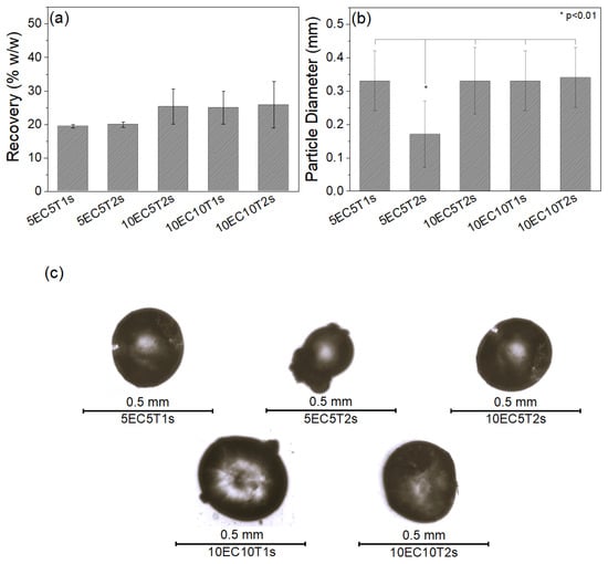 Recovery (%) of the microparticle’s different formulations appears in Figure 1a. A slight increase of % recovery is observed for the formulations containing a higher amount of polymer (10% w/v vs. 5%), without, however, any significant difference in the recovery among the different formulations with 10% w/v ethyl cellulose. The % recovery is relatively low since a considerable amount of material was aggregated and disregarded during the filtration process. The recovery capability of the proposed methodology could be enhanced by increasing the volume of paraffin oil and consequently providing the droplets with more volume to move freely and avoid aggregation. Furthermore, increasing the volume of the medium has been reported to result in smaller particle sizes due to the same reason []. Optimization of system’s stirring speed was performed before preparing the microparticles since it strongly affects their size [,], and finally, all the samples were prepared with the same optimum speed. As observed in Figure 1b, most of the formulations resulted in almost identical particle diameters, with the only exception being the 5EC5T2s formulation, which presented the smallest mean particle diameter. This variation was attributed to the lower amount of polymeric phase, in conjunction with the higher surfactant content. Surfactants not only stabilize the droplets and prevent aggregation but also decrease interfacial tension between the two phases, facilitating droplet fragmentation during emulsification []. Increasing polymer concentration has been reported to possibly cause turbulence, which is followed by diverse particle sizes and larger particle size distributions []. Furthermore, increasing polymer concentration increases the viscosity, and consequently, larger droplets are formed []. There was no significant difference to the mean particle diameter between the other particle formulations. Similar sizes have been reported in the literature [,,].