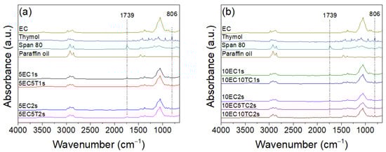 FTIR-ATR spectra of ethyl cellulose thymol, Span 80 and the respective formulations without (a) and with (b) thymol.