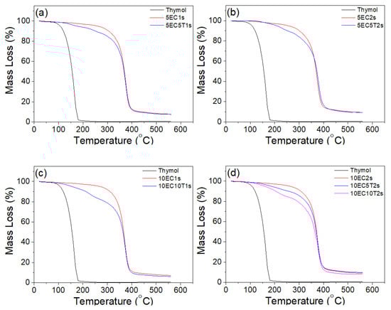 STA was used to assess the thermal properties of the thymol microparticles and determine the LC and EC of the prepared microparticles. Based on the mass loss spectra (TGA) presented in Figure 3 and the respective DTG data (Figure S1), thymol’s thermal degradation occurs at a single step, which ends at approx. 200 °C []. Similarly, ethyl cellulose-based microparticles without thymol present a single step degradation that starts at around 250 °C (onset temperature) and ends at about 500 °C []. The thermal degradation of all thymol-loaded microparticles follows a multi-step pattern that is better depicted in the DTG curves (Figure S1). The initial two steps were assigned to thymol loss. The first step (up to approx. 200 °C) designates the amount of thymol that is easily released from the capsules, while the second one (between approx. 200 and 250 °C) illustrates the amount of thymol that is less mobile due to the formation of intermolecular hydrogen bonds between thymol and ethyl cellulose, in accordance with the FTIR-ATR data. Finally, the last step was related to ethyl cellulose thermal degradation.