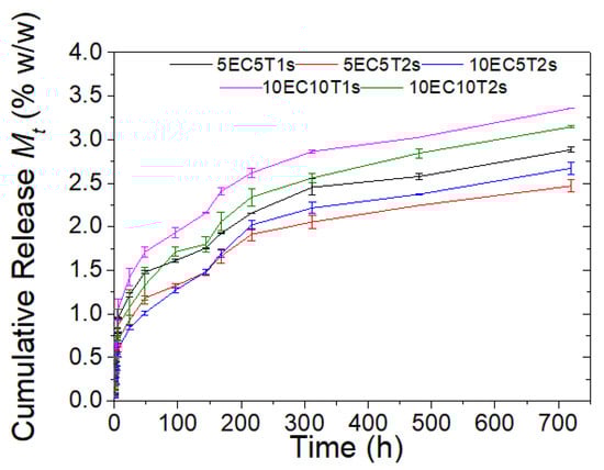 In line with the literature observations, the release rate was influenced by the bioactive substance to polymer ratio [] as well as the surfactant content. The formulation with the highest amount of thymol and the minimum amount of surfactant, i.e., 10EC10T1s, presented the highest cumulative release after 700 h, followed by 10EC10T2s. Similarly, cumulative release of thymol from 5EC5T1s was higher than that of the 5EC5T2s microparticles. This, in conjunction with the TGA results, suggests that the higher amount of surfactants results in lower thymol content, and in turn lower released bioactivity. Comparing the microparticles’ release during the initial phase, it can be concluded that the formulation 10EC5T2s releases less thymol compared to the formulation 5EC5T2s, despite having less thymol content (observed from TGA analysis), possibly due to the higher hydrophobic polymer content, which suppresses the release. It is noteworthy that at the initial burst release phase, the 5EC5T1s microparticles release a higher amount of thymol despite having lower thymol content than 10EC10T2s. This finding could be assigned to the lower polymer and/or Span 80 content of the formulation 5EC5T1s since their hydrophobic nature could inhibit thymol’s release towards the aqueous solution. Overall, it can be concluded that all the different formulations presented a gradual sustained release. Furthermore, through the adjustment of the composition, it is possible to control the release rate and profile of the bioactivity, supporting the different needs of the packaging industry.