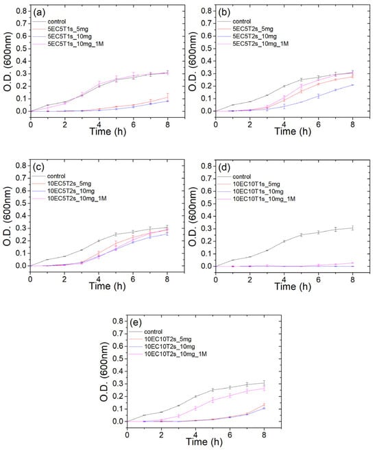 The bioactivity of microparticles was assessed against E. coli as a gram (−) representative bacterium, which is a common food contaminant. Microparticle bioactivity after one month of storage at ambient conditions was also evaluated. As observed in Figure 5, microparticles with formulation 5EC5T1s fully inhibited E. coli growth; nevertheless, after one month of storage, their antimicrobial activity diminished. Microparticles with the formulations 5EC5T2s and 10EC5T2s exhibited the smallest inhibition of E. coli growth. This finding can be associated with the higher Span 80 loading in formulation 5EC5T2s and the higher polymer to thymol ratio in formulation 10EC10T2s since Span 80 and ethyl cellulose are both highly hydrophobic, and they can retard thymol’s release towards the aqueous medium. Microparticles with formulation 10EC10T1s fully inhibited E. coli growth, and the antimicrobial activity was retained after one month of storage at ambient conditions. Similarly, 10EC10T2s presented almost full inhibition of E. coli growth, and after one month of storage inhibited E. coli growth, although its antimicrobial activity decreased. Overall, after one month of storage, formulations with the lowest thymol content lost their antimicrobial activity. Ethyl cellulose-based microspheres have demonstrated up to 12-week stability []; thus, the potential of the 10EC10T1s microparticles to maintain their stability for longer periods is high.