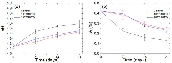 The efficiency in maintaining the freshness and quality of cherry tomatoes stored at ambient conditions was evaluated for the microparticle formulations with the highest thymol content. During storage, tomato pH is estimated to rise and titratable acidity to decline as organic acids degrade to other sugars due to respiration or due to the action of microorganisms. Therefore, smaller pH or titratable acidity deviations from the initial value indicate enhanced quality characteristics, while in the literature the acceptable tomato pH range is noted to be 4.5 to 5 []. As observed in Figure 6a, the control tomatoes indicate an unacceptable pH on day 14, while the pH of the tomatoes stored into the packaging with the microparticles is within the acceptable levels even after 21 days of storage at ambient conditions. Both microparticle formulations managed to maintain a notably more stable pH and titratable acidity (Figure 6b) of the tomatoes compared to the control. This finding is in accordance with the established literature, which denotes the beneficial role of essential oils in suppressing ethylene production [,,], a plant hormone responsible for activating the respiratory enzymes, increasing respiration rates and decomposing carbohydrates into sugars. Overall, the beneficial role of microparticles in maintaining the quality of tomatoes stored under ambient conditions is evident from the results.
