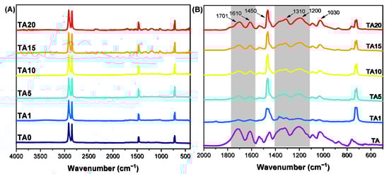 FTIR spectra of the prepared composites. (A) Full spectra and (B) zoom-in of the 500–2000 cm−1 region (TA: tannic acid, TA0: neat HDPE).