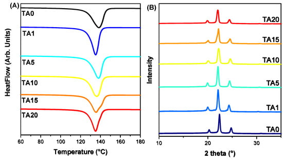 (A) Melting peak temperatures of neat HDPE and the HDPE/TA composites, heating rate: 20 °C/min. (B) XRD patterns of HDPE/TA composites.
