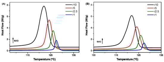 Cooling curves of (A) TA1 and (Β) TA20 at cooling rates ranging from 1 to 10 °C/min.