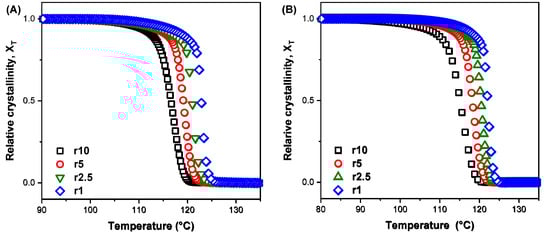 Plots of relative crystallinity versus temperature for non-isothermal crystallisation of (A) TA1 and (Β) TA5 composites at cooling rates from 1 to 10 °C/min.