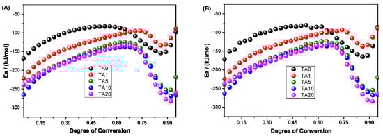 The various methods of the isoconversional approach brought up by Friedman and the way of studying an entire dataset explained by Vyazovkin were put to use on the activation energies, Eα, of the HDPE/TA composites [,,,]. A plot of the Eα values of neat HDPE and the HDPE/TA composites against the degree of conversion α using the mentioned isoconversional techniques is displayed in Figure 5. The results revealed that the activation energy underwent a period of fluctuations during the procedure. This trend indicates that the polymer system experiences more and more difficulty crystallising as the process reaches its end. As the process progresses, the melt crystallisation mechanism changes, and the polymers begin to acquire the required activation energies. However, the Eα dependency shows how complicated the melt crystallisation process is: it shows that there are many steps, each with its own energy barriers and contributions. Furthermore, the (E-α) curves computed via the Vyazovkin method (Figure 5B) exhibited a similar trend to those obtained using the Friedman method. The Eα values for neat HDPE and the HDPE/TA composites are negative and increase as the degree of conversion increases; this behaviour is attributed to the nucleation control during the process. The HDPE/TA composites present lower activation energy values than those of neat HDPE, indicating that the addition of TA filler accelerates the crystallisation process.