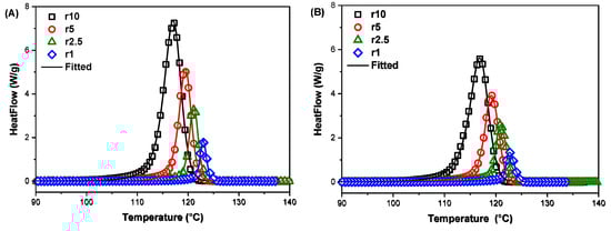 Heat flow curves of (A) TA1 and (Β) TA20 samples versus temperature and the corresponding fitting of multivariate nonlinear regression of the Sbirrazzuoli model.