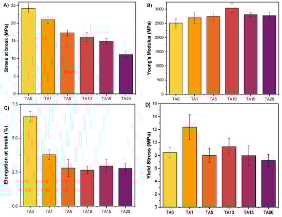 Mechanical properties of neat HDPE and the HDPE/TA composites. (A) Stress at break, (B) Young’s modulus, (C) elongation at break, and (D) yield stress.