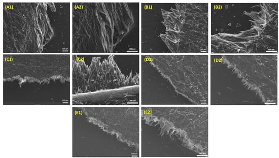 Fractured surfaces after tensile testing as observed by scanning electron microscopy (SEM), at two different magnifications (images labelled with the number “1” were taken at a magnification of ×100; images labelled with the number “2” were taken at a magnification of ×200). (A) TA1, (B) TA5, (C) TA10, (D) TA15, and (E) TA20.