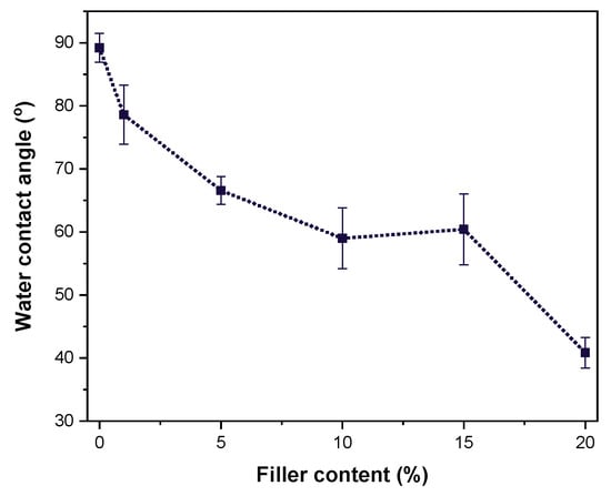 Water contact angle measurements are presented in Figure 10. As expected, due to the incorporation of tannic acid, which is relatively hydrophilic, a reduction in the water contact angle is observed. TA20 exhibits the lowest value (41°), which is significantly lower than that of neat HDPE [].