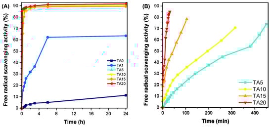 Finally, the radical-scavenging ability of the HDPE/TA composites was evaluated with the DPPH method (Figure 11). As expected, neat HDPE exhibited negligible radical-scavenging activity. Tannic acid exhibits high antioxidant activity [], and its presence conferred important antioxidant properties to the HDPE/TA composites as well. The antioxidant activity is proportional to the TA content, and it is noteworthy that TA20 could decrease the free radical concentration by 85% within 30 min. Even TA1, displaying the lowest activity, could decrease the DPPH radical concentration by 60% within 6 h.