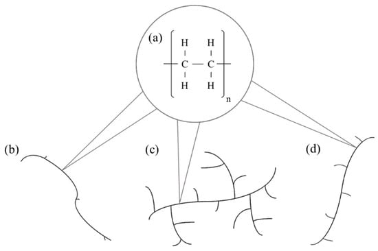 Scheme of (a) the repeating unit of PE; schemes of the main molecular structures of PE differing in linearity and branching: (b) HDPE, (c) LDPE, and (d) LLDPE.