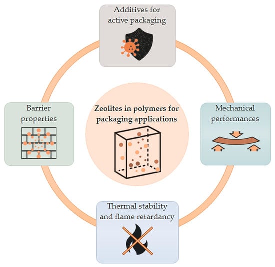 It is worth noting that, according to its physicochemical structure, each polymer has a certain compatibility with given zeolites (whose polarity increases with the Si/Al ratio), and this compatibility affects the matrix–additive adhesion and so the final composite properties as well [97]. Improvements and new functionalities derived from these hybrid inorganic–organic composites, along with possible technological limits with respect to neat polymers, are highlighted.