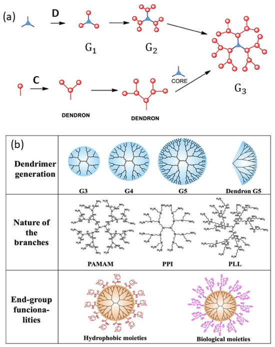 - In [151], the authors review the properties and applications of quintessential dendrimer varieties such as polyamidoamine (PAMAM), poly(propylene imine) (PPI), polylysine (PLL), and polyester dendrimers (see Figure 15b). The focus of the work lies in the discussion of the essential properties and applications of these types of dendrimers, which are widely used today.