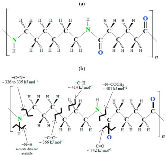 Rational formulae of (a) thermoplastic polyamide 66 and (b) indicating bond-dissociation energies (BDEs) [6,7,8,9]. Carbon, nitrogen, oxygen, and hydrogen symbols are depicted in black, green, blue, and black (smaller letters). For the (-N-H) bond, accurate data have not been found [9].