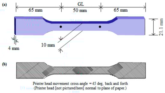 Composite samples (short-CF-reinforced polyamide 66 (SCFRPA66: Ultrafuse® PAHT CF15, BASE Ltd., Tokyo, Japan) were shaped by a 3D-printer (Kobra Neo, Anycubic Ltd. Tokyo: see Figure 2). The feeding wire was a composite prepared by short straight CFs (6 μm diameter; 85 +/− 15 μm length) wrapped by PA66, made molten, then cooled. The SCFRPA66 filament was heated and melted at the tip and cooled on the deposited samples. The printing temperature at the tip was 260 °C, which is about the same as the melting point of PA66 [43]. The glass transition temperature, Tg, of PA is reported to be 70 to 90 °C [44]. The nozzle was perpendicular to the specimen surface. The head moved along the cross-length of the specimen programmed to the dog-bone shape, building it up layer by layer with cross angle of 45° (see Figure 3). There was no mold used to form the dog-bone shape. The flow rate of the polymer out of the nozzle was 50 mm/s. The nozzle hole diameter was 0.4 mm, while the distance between the nozzle and the printing surface was 0.2 mm. The depositing speed was precisely indicated by both the depositing periods of one layer (3 min) and of a dog-bone sample (56 min). Figure 3 illustrates the 3D-SCFRPA66 dog-bone specimen dimensions: a gauge length, thickness, width, and total length of 50 mm, 4 mm, 10 mm, and 180 mm, respectively. Since the sample thickness is 4 mm, each deposited layer is calculated to be ~214 mm. The CF volume fraction (Vf) was approximately 15%. There was no infill. SEM observation showed no air gaps in the composite filament before printing; and none in dog bone samples after printing (before tensile testing). In this experiment, gels were not used and were not observed.