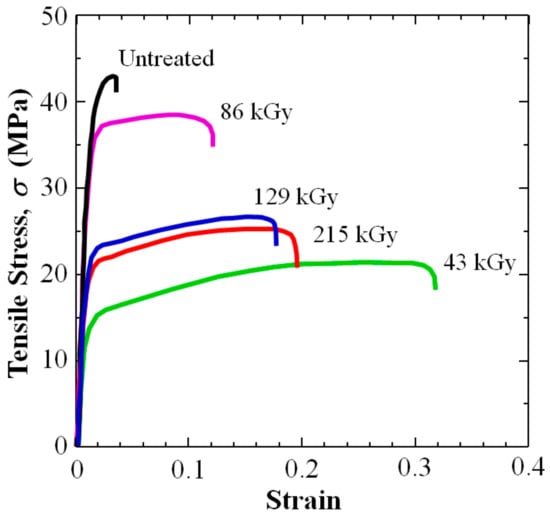 But interestingly, Figure 9a,b show the 86 kGy dose resulted in a recovery of σts and (ds/de)i over that of the 43 kGy dose. The 86 kGy dose showed an increased σts and a [dσ/dε]i of 39.0 MPa and 4.04 GPa over those of the 43 kGy dose at 21.5 MPa and 0.96 GPa, but decreased ductility, εts and εf, and toughness, Ehd. This can be explained by crosslinking in the “skins” by the higher 86 kGy dose acting to increase the tensile strength and brittleness.