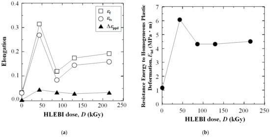 Table 1 and Table 2 list values and percentage changes, respectively. Particularly, the 43 kGy HLEBI dose appears to be the optimum out of the doses tested, increasing εts, εf, Δεppd, and Ehd by 771%, 829%, 1433%, and 404%, respectively, from 0.031, 0.034, 0.003, and 1.20 MPa·m (untreated) to 0.270, 0.316, 0.046, and 6.05 MPa·m (43 kGy). Since the increase is substantial, this result is considered valid. The 215 kGy dose increases εts, εf, Δεppd, and Ehd by 416%, 471%, 1033%, and 289%, respectively, over that of untreated samples to 0.160, 0.194, 0.034, and 4.67 MPa·m (43 kGy).