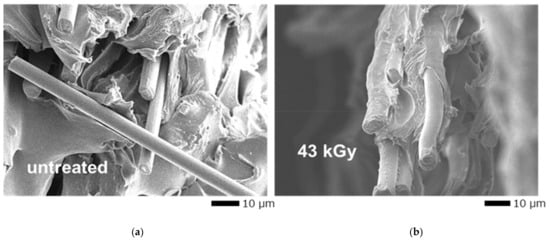 The ductility (εts, εf, and Δεppd) and toughness (Epd) improvements can be explained by four factors. First, the severing of PA66 polymer chains would allow more freedom of movement between the shortened polymeric chains to withstand higher strains. Secondly, lone-pair electrons generated in the matrix may have bonded with CFs more efficiently. This has been found for Ti-CF-TP joints connected by a CF insert: when bare CF was activated with HLEBI prior to dipping in molten TP, the tensile strength of the joint was increased by increased adhesion between the difficult-to-adhere CF and TP [52]. Thirdly, by HLEBI, dangling bond generation creates repulsive forces between outer shell electrons within the polymer matrix [38], increasing the compressive stress on the CF and raising the adhesion force. Fourthly, since HLEBI relaxes the polymeric chains, it is also difficult for brittle cracks to generate and propagate at the CF/TP interface. This is supported by the SEM photomicrography in Figure 8 showing increased CF/PA66 matrix adhesion in the fractured 43 kGy sample compared with that of the untreated sample. To estimate the quantity of increase in PA66/CF interfacial adhesion sites by HLEBI-treated 3D-SGFRPA over untreated samples, plots of dangling bond density (×10−12 spins/mm3) vs. penetration depth, Dth, into the specimen must be determined. This has previously been performed with polyetheretherketone (PEEK) by meticulously cutting successive layers and analyzing them by ESR in [42].
