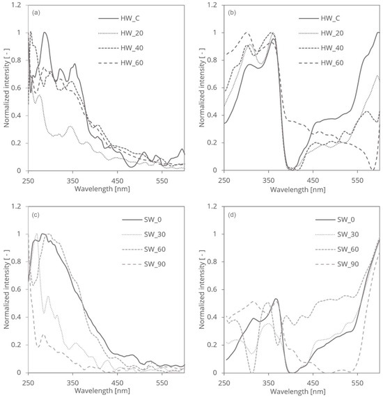 Photoacoustic spectroscopy (PAS) spectra of HW (a) and SW (c) samples and reversed double-beam photoacoustic spectroscopy (RDB-PAS) spectra of HW (b) and SW (d) samples.