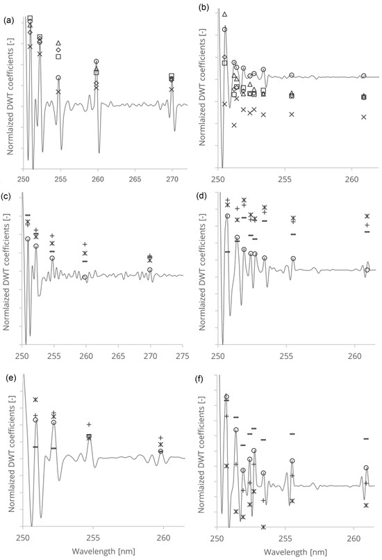 DWT of photoacoustic spectroscopy spectra of WFP (a), HW (c) SW, (e) and DWT of reversed double-beam photoacoustic spectroscopy spectra of WFP (b), HW (d), and SW (f) samples. The symbols indicate:
