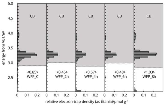 The protonation of hydroxyl groups and the potential cleavage of glycosidic bonds by HCl vapor treatment create new radical sites or carbocations for electron trapping [36]. The energy levels of the electron traps in chemically processed cellulose fibres were below the conduction band (grey area) of 4.1–3.0 eV (Figure 6). The deep electron trap band distribution of WFP type cellulose was located further toward the conduction band, centred at 3.9 eV in the control sample. As the HCl vapor hydrolysis time increased to 6 h, the deep electron bands moved to a lower energy range. As crystallisation occurred at 8 h treatment, the deep electron bands moved back to a higher energy level and at the same time increased in intensity. The shallow traps’ centre was not changed; however, the intensity increased at 8 h treatment and exceeded the control sample. The degree of polymerisation was reduced by 85% after 8 h treatment [37,38,39], resulting in higher crystallinity and thermally more stable cellulose material.