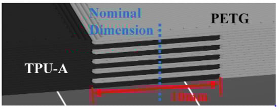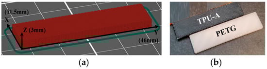 In order to characterize dynamic material properties using DMA, 3D-printed samples of the materials were produced. These samples were fabricated with fused deposition modeling using the Prusa i3 MK3s (Prusa Research, Partyzánska, Czech Republic) equipped with an MMU2s auxiliary. This unit is capable of producing both single- and multiple-material parts with a single nozzle using the filament switching capability of the MMU2s attachment. For the purposes of constructing axially graded composites, two materials were selected based upon criteria including toughness, flexibility, adhesion to each other, and printable temperature ranges: (a) Polymaker PolyLite (Polymaker, Missouri City, TX, USA) polyethylene terephthalate glycol (PETG) and (b) NinjaTek Cheetah (Fenner Precision Polymers, PA, USA) thermoplastic polyurethane (TPU-C) with 95A hardness. The DMA specimen dimensions were chosen to be 11.5 × 46 × 3 mm as shown in the screenshot of the specimen in the printer slicing software (PrusaSlicer 2.6) with the respective dimensions and axes, which can be seen in Figure 1.
