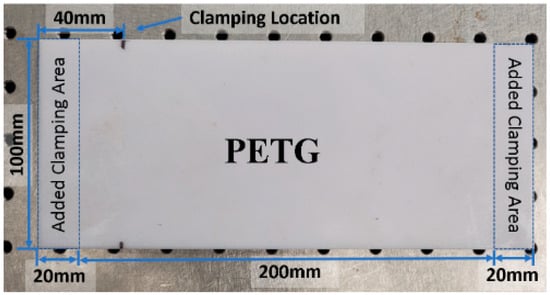 In order to fabricate a graded plate for subsequent vibration analysis in cantilever configurations, a CreatBot F430 (Henan CreatBot Technology Ltd., Zhengzhou, China) printer was used to fabricate the plate sections of both PETG and TPU-A materials. The following nominal dimensions were selected: 100 × 200 × 4 mm. It was decided to add an additional 20 mm onto both 100 mm sides for clamping purposes, thereby making the total length 240 mm. The dimensions and layout of a typical sample are shown in Figure 2.