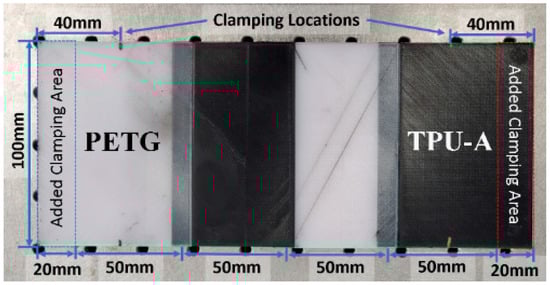 The individual plates were joined using a 10 mm tongue and groove arrangement with a Loctite plastic epoxy applied to the area to prevent separation at the joint (see Figure 4). A DMA specimen for this layered PETG/TPU-A section was also created to perform a subsequent dynamic characterization of material properties to be used for numerical simulation and experimental validation studies.