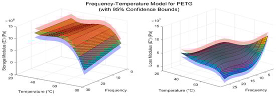 Temperature and frequency curve-fitted plots with confidence bounds for estimating E′(ω,T) and E″(ω,T) for PETG. The color surface contour plots mark the 95% confidence interval.
