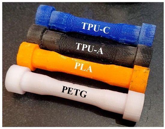 In this study, for greater accuracy, the experimental testing of each 3D-printed sample was performed on an MTS biaxial servo-hydraulic test frame equipped with both axial and transverse extensometers. The samples were designed to be used with custom split collars designed for soft polymer materials. The samples are shown in Figure 6.