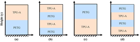 Grading scheme for experimental specimen: (a) PETG/TPU-A 1y, (b) PETG/TPU-A 2y, (c) TPU-A/PETG 1y, and (d) TPU-A/PETG 2y.