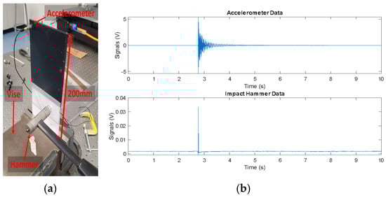 Finally, the plate specimens were clamped into a bench vise such that the nominal dimension (100 × 200 × 4 mm) was cantilevered upwards with 40 mm of the specimen clamped in the vise. A PCB 086C03 (PCB Piezotronics, Depew, NY, USA) impact hammer and a PCB U352C66 ICP (PCB Piezotronics, USA) accelerometer were used for the vibration testing of the plates. The accelerometer was mounted to the upper corner of the specimen, and the specimen was excited with the impact hammer. For example, the testing setup for grading scheme TPU-A/PETG 1y shown in Figure 7c can be seen in Figure 8a.