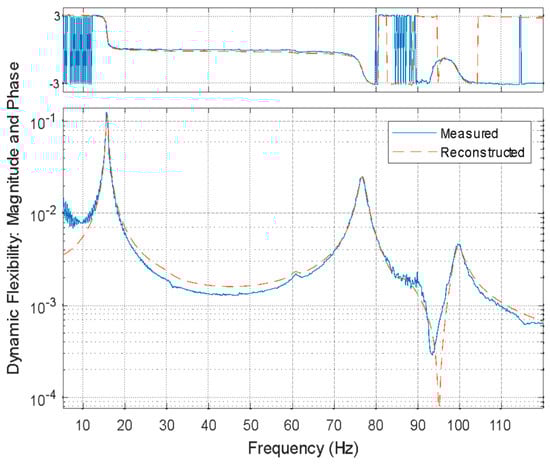 For each plate orientation associated with different grading schemes in Figure 7, four modal vibration tests were performed where the plate was excited with the impact hammer force and the accelerometer was used to obtain the response of impact testing. A representative input (hammer excitation) and representative response (acceleration data) are shown in Figure 8b. For each test, frequency–response function (FRF) values were extracted and curve fitted using the MATLAB® vibration toolbox. From the curve-fitted data, the natural frequencies associated with any given modes of vibration and associated damping ratios were extracted. For example, a representative curve-fitted FRF shown in Figure 9 allows the estimation of the natural frequencies and damping ratios of the first three modes of vibration of the graded plate.