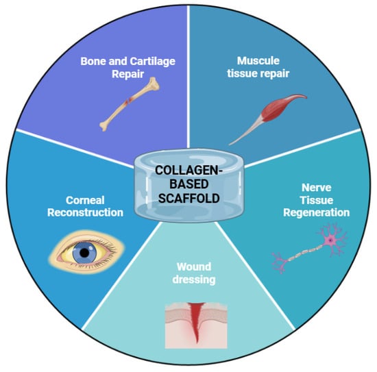 Collagen-based scaffolds can be used in various fields of medicine, such as to restore volumetric muscle losses [16], as a basis for bone and joint implants [17,18], in the treatment of corneal diseases [19,20,21], for the restoration of nerve tissue [22,23], and as wound dressings [24,25] (Figure 1).
